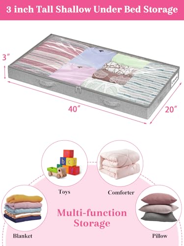 Specification: Low Profile Under Bed Storage, 3 Inches High Underbed Storage Containers Bins, NO STRUCTURE, Foldable Clothes Storage and Organizer with Lid & Zipper, Shallow Storage for Low Bed Couch Crib, 2-Pack
