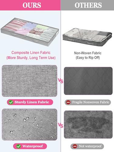 【Premium Composite Linen Durability】This under bed storage containers feature a NO STRUCTURE, soft-sided design that easily conforms to tight spaces. Constituted of premium composite linen with a water-proof coating for long-lasting, dust-free storage.