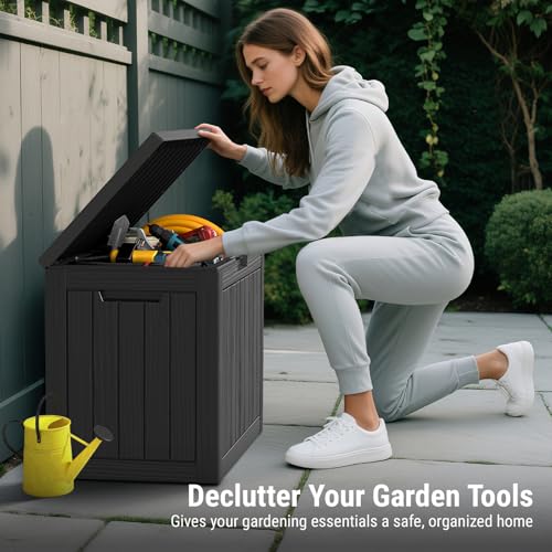 【Versatile Storage Solution】- Keep your outdoor area neat and organized with this versatile deck box, perfect for storing patio couch or lounge chair cushions, pool accessories like towels and cleaning supplies. Use it to store gardening tools or as a safe spot for porch deliveries, even doubles as a small side table