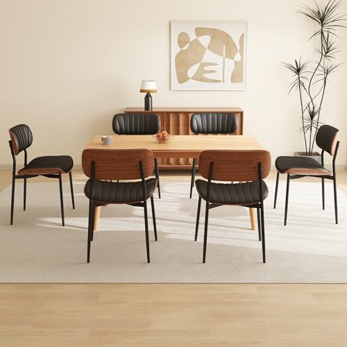 Modern PU Leather Dining Room Chairs Set of 6, Upholstered Kitchen Chairs with Walnut Bentwood Back and Metal Legs Adjustable Feet for Kitchen Dining Room(Balck)