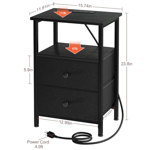 Specification: Night Stand, Nightstand with Charging Station, End Table with Storage 2 Fabric Drawers for Bedroom, Small Bed Side Table with USB Ports and Outlets for Living Room, Black, HETS020BK-1