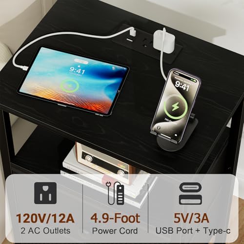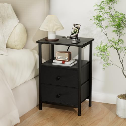 Night Stand, Nightstand with Charging Station, End Table with Storage 2 Fabric Drawers for Bedroom, Small Bed Side Table with USB Ports and Outlets for Living Room, Black, HETS020BK-1