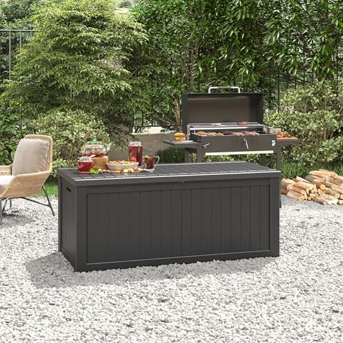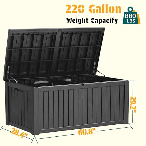 Specification: NUNU LAB 220 Gallon Outdoor Storage Box Waterproof, Outside Package Delivery Deck Boxes with Lockable Lid, Backyard Storage Bin For Garden Tools, Patio Cushions, Black