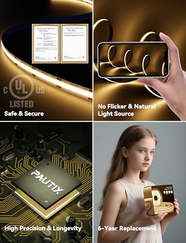 【Lead-free Materials & UL Listed】Designed with lead-free materials, PAUTIX COB LED strip lights are more environmentally friendly and protect your health than others. 24V low voltage no longer worry about electric shock, safer to use; low power consumption, energy saving. UL Listed, the quality is more trustworthy!