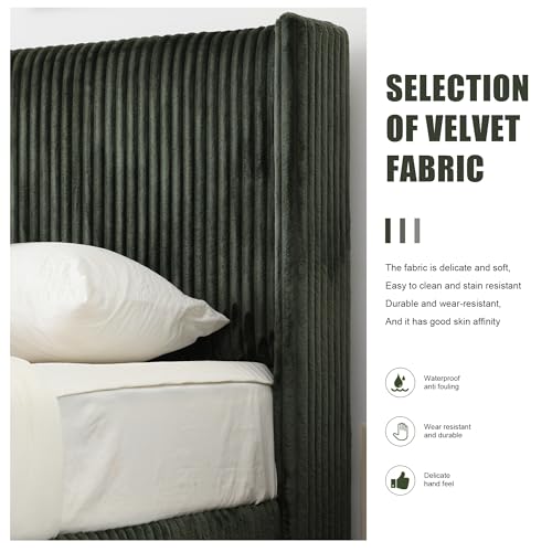 PINJU Twin Size Bed Frame, Upholstered Platform Bed with Modern Vertical Striped Wingback Headboard with Wooden Slats, Easy to Assemble No Noise Free (Green, Twin)