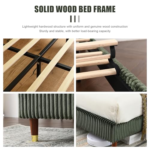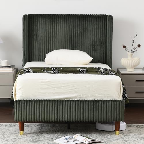Specification: PINJU Twin Size Bed Frame, Upholstered Platform Bed with Modern Vertical Striped Wingback Headboard with Wooden Slats, Easy to Assemble No Noise Free (Green, Twin)