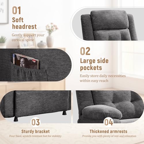 Ergonomic Detailed Design: Designed for lasting comfort, our recliners feature high-resilience foam and spacious seats. Its ergonomic segmented backrest and padded footrest provide exceptional lumbar and leg give a boost to. Perfect for extended sitting periods, this electric recliner helps reduce pressure and relieve fatigue in your back and legs. Dual side storage pockets on the chair are convenient for storing phones, magazines and more—bringing hassle-free convenience to your lounging experience.