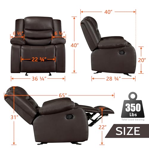 【OVERSIZED RECLINER】- This Luxurious single recliner chair Dimension is 37″ W × 39″ D × 40″ H, seat dimensions – 23″ W x 22″ D x 19.7″ H, 65″ length when reclined. The sturdy wood frame with a heavy-duty steel mechanism is designed to support up to 350 lbs, which fits most Big Men. Kindly please confirm the size before buying.