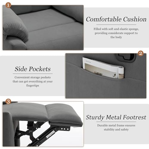 Specification: Recliner Chair, Small Recliners for Small Spaces, Upholstered Manual Recliner with Side Pockets, Comfy Corduroy Chairs for Living Room, Bedroom, Reading, Grey