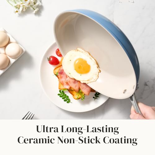 CERAMIC NON-STICK COATING: Our innovative cooking surface undergoes a triple-layer ceramic coating process, durable and totally protected. The non stick frying pans excels in delivering outstanding nonstick performance, enabling you to prepare your favorite dishes with minimal oil or butter usage
