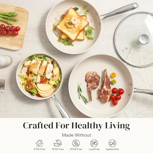 RAPID & EVEN HEAT DISTRIBUTION: Precision-engineered with bottom, our ceramic cookware set ensures uniform heat distribution, eliminating hot spots that can disrupt your cooking. This professional-grade design disperses metal thickness consistently across all the nonstick cooking skillet, facilitating swift and even cooking of your dishes