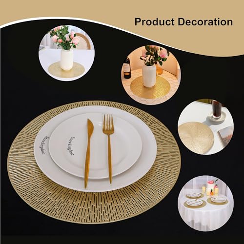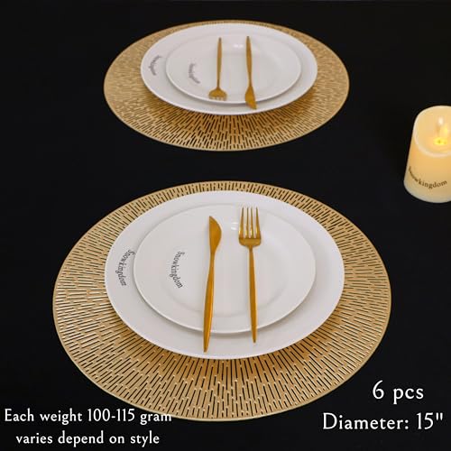 Specification: Round Placemats Gold Metallic Set of 6 Vinyl Hollow Placemats 15 Inch, Washable Easy Clean Wipeable Non Slip Stain Heat Resistant Dining Table Place Mats for Wedding Party Decoration by Snowkingdom