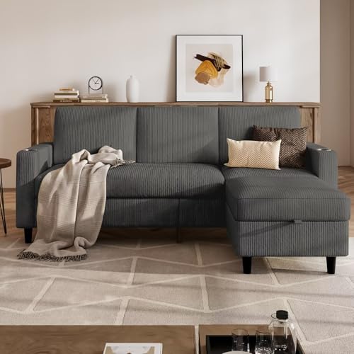 Specification: Sectional Couches for Living Room, L Shaped Couch with 2 Cup Holders, Small Sofa Corduroy Couch with Storage Ottoman, Modern 3 Seater Convertible Sofa for Apartment, Office, Dark Grey