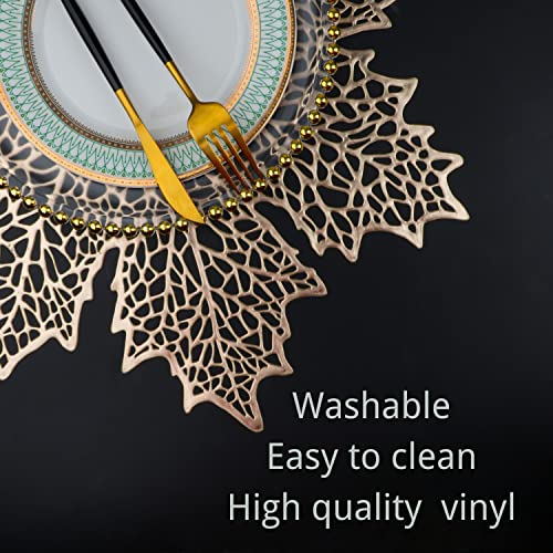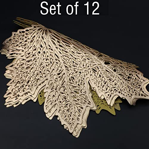 Snowkingdom Fall Thanksgiving Maple Leaf Placemats Sets of 12, Gold Round Vinyl Table Mats Pressed Metallic Hollow Out Place Mats for Autumn Harvest Holiday Party Wedding Accent Centerpiece