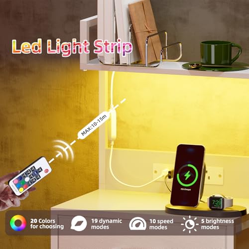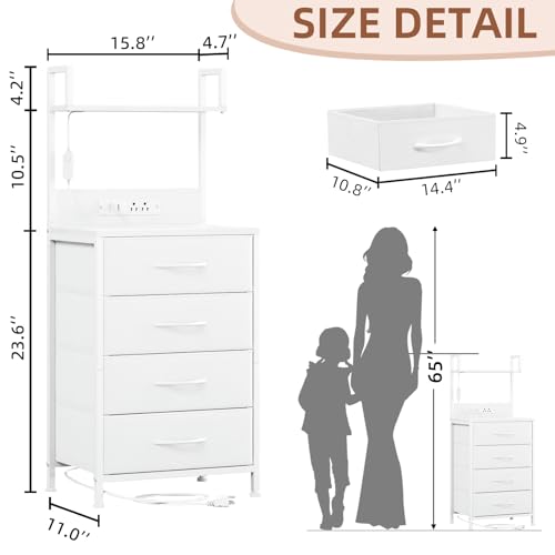 Specification: Somdot White Nightstand with Charging Station and LED Lights, Bedside Table Tall Night Stand with 4 Fabric Drawers and Top Shelf for Bedroom Guest Room Dorm Hallway