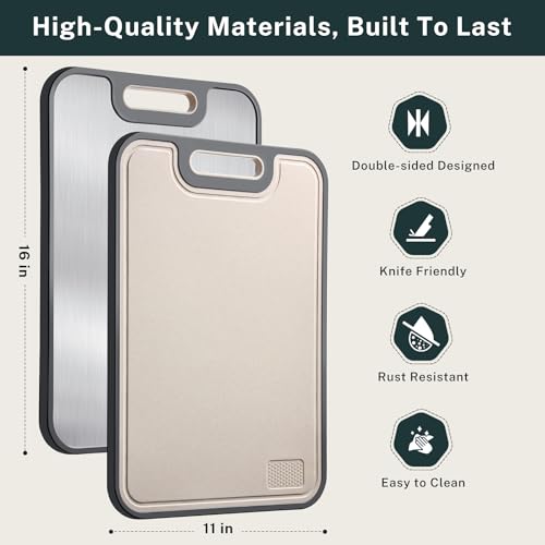 Durable & Food-Protected Materials: The cutting board features 18/8 stainless steel on one side and food-grade PP at the other, ensuring durability and safety. This dual-sided cutting board is BPA-free, making it Protected for direct food contact. Built to last, its sturdy construction resists wear and tear, making it the easiest companion for meats, fruits, vegetables, and more.