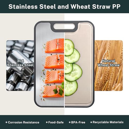 2-in-1 Smart Cutting Board: No more mixing foods! One side uses rust-proof stainless steel (Protected for raw chicken/steak),the other side is natural wheat straw (perfect for fruits/salads).Both materials may not soak up smells or stains, keeping your meals safer.
