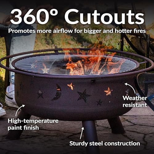 HEAVY DUTY AND RUST RESISTANT: The backyard fire pit is made from durable steel and is finished with a rustic, high-temperature paint for long-lasting quality and added resistance to rust. The fire pit is lightweight and portable, allowing it to be moved anywhere easily. It has decorative star and moon cutouts that complement any outside decor style.