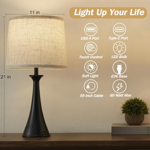 Specification: Touch Table Lamp for Living Room Bedroom, 21″ Table Lamps Set of 2 with USB C+A Ports, Touch Bedside Lamps for Nightstand with 3 Way Dimmable, 2 LED Bulbs Included, Black
