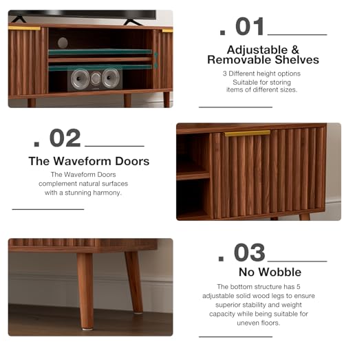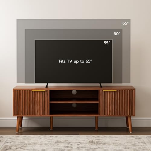 Specification: TV Stand for Living Room, Mid Century Modern Entertainment Center for 55/60 inch TVs, TV Console with Fluted Door Cabinets and Open Shelves, for Bedroom, Walnut