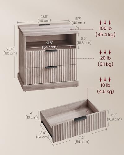 Specification: VASAGLE MAXE Collection – Set of 2 Nightstands with Charging Station, Fluted Night Stand, Bedside Table, Mid Century Modern Side End Table, 2 Drawers, 2 AC Outlets, 2 USB Ports, Washed Gray ULET926G01
