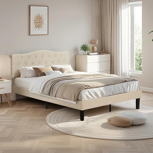 Specification: VECELO Full Size Platform Bed Frame with Fabric Upholstered Headboard and Wooden Slats Support, No Box Spring Needed/Easy Assembly,Beige
