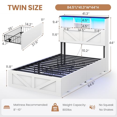 Specification: VIAGDO Farmhouse Bed Frame Twin Size with Bookcase Storage Headboard, Charging Station and LED Lights, Wooden Twin Bed Frames with 4 Drawers, Barn Door Design, No Box Spring Needed, No Noise, White