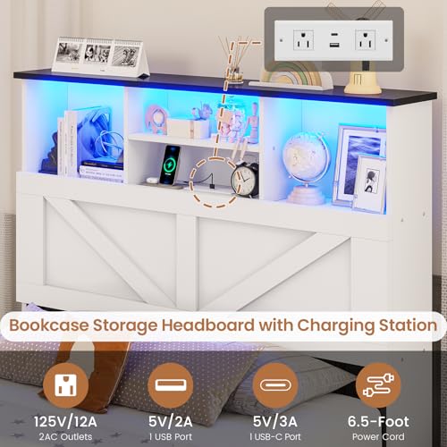 【Customized LED Lights】The farmhouse white twin bed frame with headboard and storage is equipped with a light strip that can change multiple colors and modes. The LED lights boast over 60000 colors, 29 dynamic modes, brightness&speed adjustable, schedule on/off, dual control by remote or phone APP to customize your favorite style. Plus, the lights also sync with music and make lights dance, which can create a relaxing and romantic atmosphere in the room.