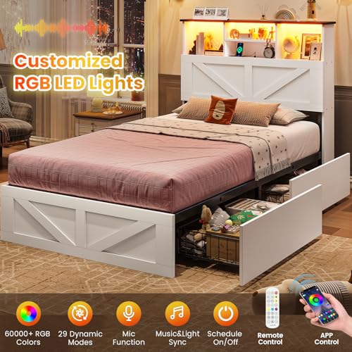 【Customized LED Lights】The farmhouse white twin bed frame with headboard and storage is equipped with a light strip that can change a couple of colors and modes. The LED lights boast over 60000 colors, 29 dynamic modes, brightness&speed adjustable, schedule on/off, dual regulate by remote or phone APP to customize your favorite style. Plus, the lights also sync with music and make lights dance, which can create a relaxing and romantic atmosphere in the room.