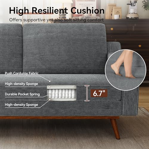 Vipbear 65.4″ Loveseat Sofa Grey Corduroy Couch, Mid-Century Modern Small Couches for Living Room, Bedroom, Office, Comfy Sofa with Spring Cushion, Solid Wood Frame, Tool-Free Assembly