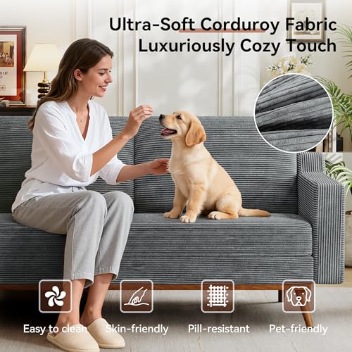 Specification: Vipbear 65.4″ Loveseat Sofa Grey Corduroy Couch, Mid-Century Modern Small Couches for Living Room, Bedroom, Office, Comfy Sofa with Spring Cushion, Solid Wood Frame, Tool-Free Assembly
