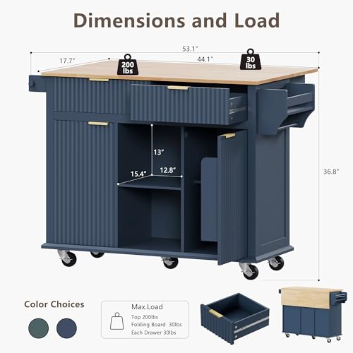 Specification: win2win Rolling Kitchen Island with Storage, Portable Fluted Kitchen Island with Drop Leaf, 2 Drawers and 2 Cabinets, Modern Farmhouse Kitchen Cart on Wheels with Towel Rack, Spice Rack, Blue