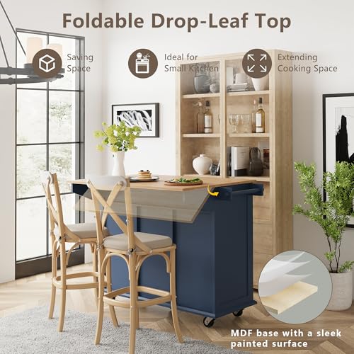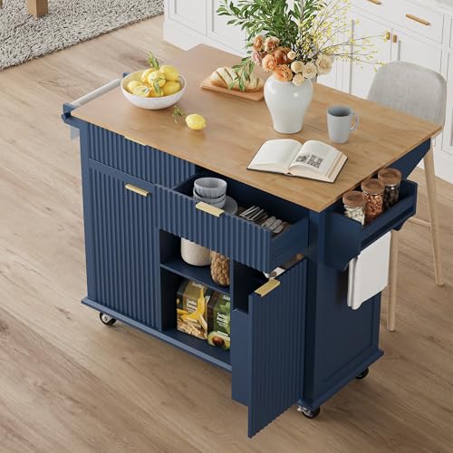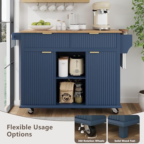 win2win Rolling Kitchen Island with Storage, Portable Fluted Kitchen Island with Drop Leaf, 2 Drawers and 2 Cabinets, Modern Farmhouse Kitchen Cart on Wheels with Towel Rack, Spice Rack, Blue